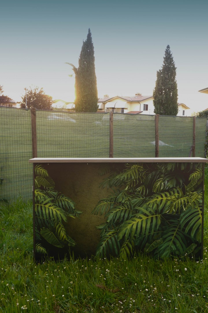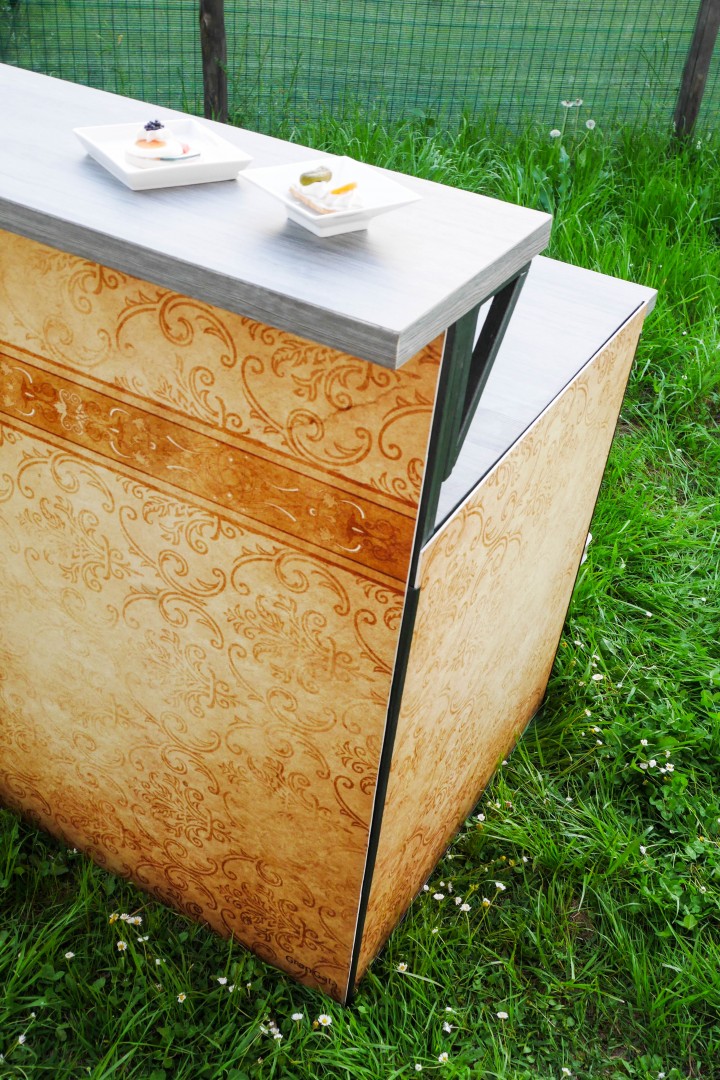 Nella parte inferiore la postazione bar comprende : mini frigo con piccolo congelatore da lt 46 totali con assorbimento di 60 watt, cassetta estraibile per alloggiare bottiglie o varie, quadro di corrente a norma vigente completa di n. 4 prese per attaccare eventuali utensili ( frullatore, tritaghiaccio ecc) Infine la postazione bar viene fornita di panelli bifacciali versatili per ogni contesto o luogo