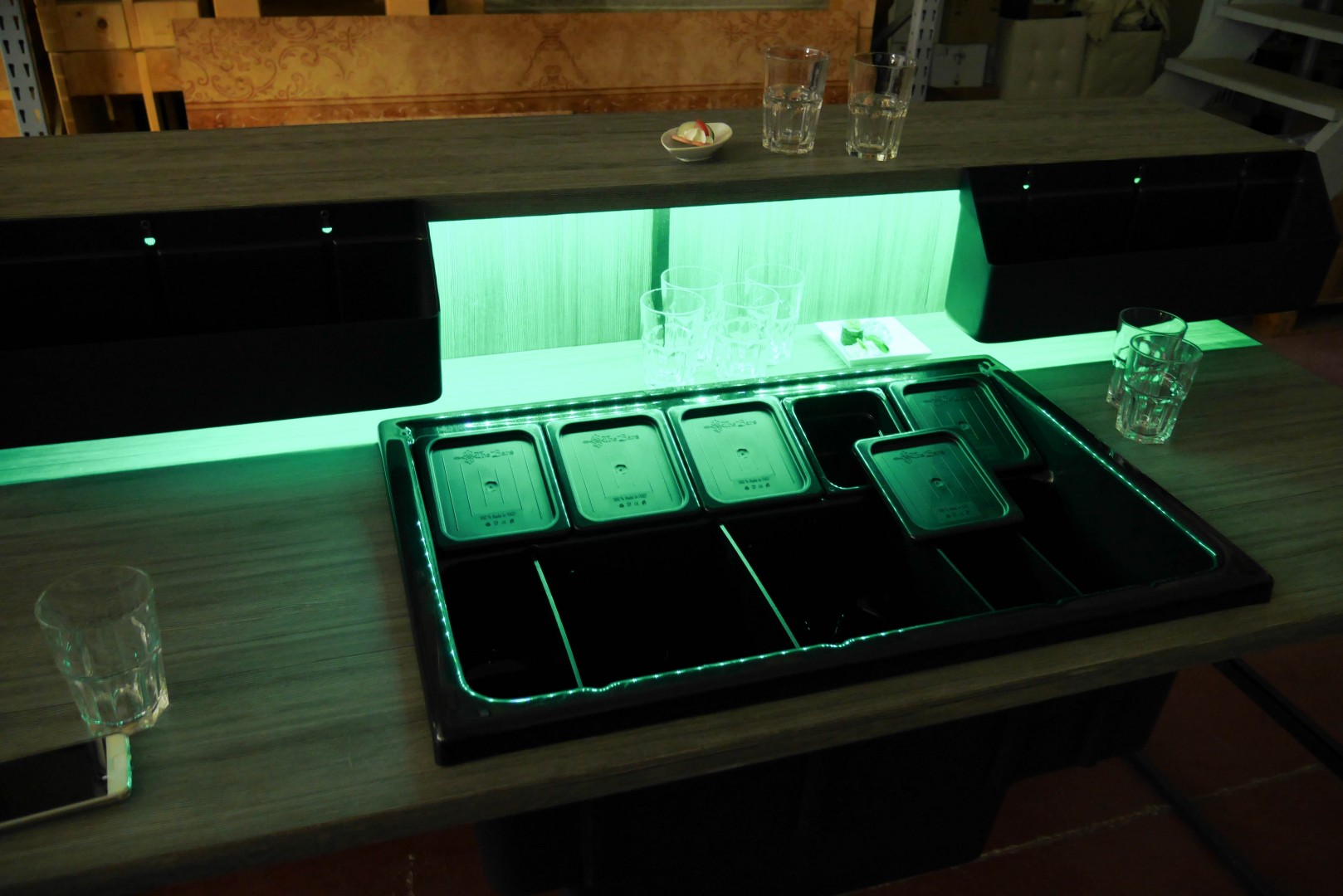 Postazione bar completa di Workstation di colore nera versatile e funzionale completa di gruppo di scarico sifonato, coibentata mediante una controvasca di schiuma poliuretanica potrai tenere il ghiaccio a temperatura per diverse ore evitando che si sciolga. é dotata di n. 5 vaschette per alimenti completi di coperchi ermetici , il piano di lavoro compresa la Workstation è di 180 cm , ripiano superiore chiudibile pratico per appoggiare bicchieri Cocktail sempre di misura 180 x40 cm . Il ripiano è dotato di n.2 speed Rack di 56 cm di lunghezza per contenere n. 5 bottiglie ciascuna , il piano è dotato di illuminazione a led rgb a batteria con varietà di colori a scelta con uso di telecomando